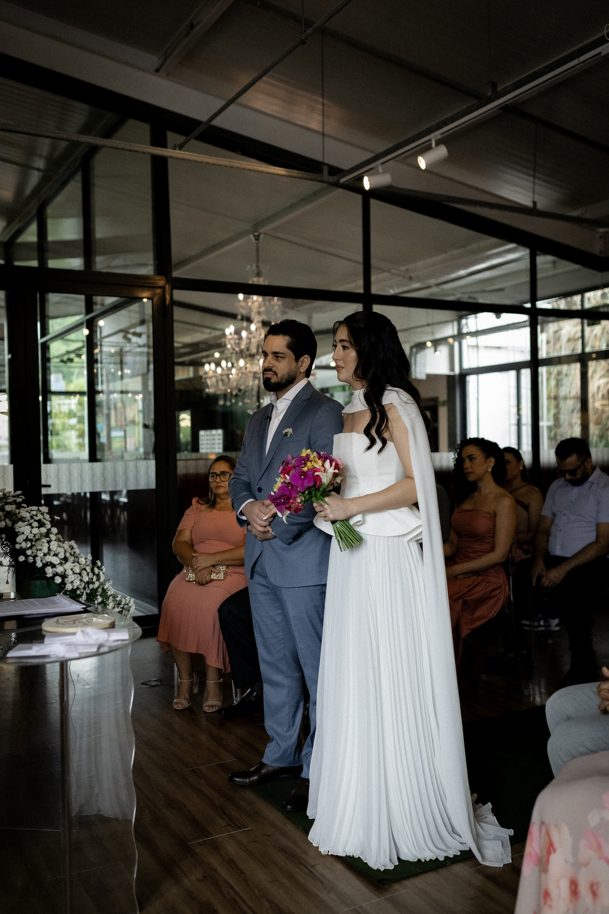 Na Galeria Thomé Bistrô, a Julia e o Juliano escolheram viver o dia cercado por apenas 15 pessoas. Quinze nomes que realmente fazem parte da história. Quinze olhares atentos. Quinze abraços que carregam memória.